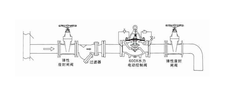 600X水力电动控制阀由主阀、电磁导阀、针阀、球阀、微形过滤器和压力表组成水力控制接管系统。通过电磁导阀可以实现对阀门开启和关闭的遥控。加装附加装置后,可控制开启和关闭的速度。当阀门从进口端给水时,水流流过针阀进入主阀控制室,当电磁导阀打开时,控制室内的水经电磁导阀、球阀流出。球阀开度大于针阀开度,主阀控制室内压力很低,主阀处于全开状态。当电磁导阀关闭时,主阀控制室的水不能流出,控制室升压,推动膜片关闭主阀。该阀利用导阀控制阀门的开启和关闭,节省能源。可代替其它阀门大型电动装置。广泛用于高层建筑、生活区等供水管网系统及城市供水工程。