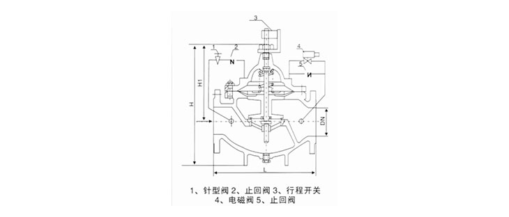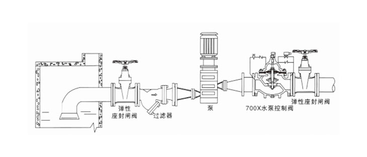 700X水泵控制阀由主阀、电磁导阀、针阀、球阀、单向阀、行程开关、微形过滤器和压力表组成水力控制接管系统。水泵需停止工作时,先由进口压使主阀关闭90%后,水泵停止运转。剩余10%由回水关闭,可防止水锤现象发生。