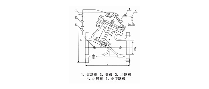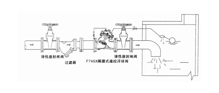 F745X隔膜式遥控浮球阀是兼具多种功能的水力操作式阀门。主要安装于水池或高架水塔的进水口处,当水位达到设定的高度时,主阀由浮球导控制关闭进水口停止供水;当水位下降后,主阀由浮球导阀控制打开进水口向水池注水,实现自动补水。液位控制精确,不受水压干扰;隔膜式遥控浮球阀可随水池的高度及使用空间任意位置安装,维护、调试、检查方便、密封可靠,使用寿命长。隔膜式阀门性能可靠、强度高、动作平稳,适用于DN450mm口径以下的管道。