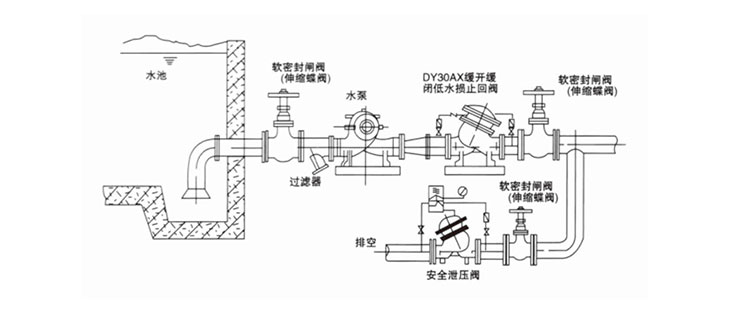 DY30AX缓开缓闭多功能止回阀由阀体、阀盖、阀瓣、阀杆、弹簧、导阀等零件组成。上阀盖与下阀盖之间为隔膜腔,隔膜腔内设隔膜,隔膜与中心轴连接,中心轴另一端连接阀门,阀门与阀座接触。水容器与上阀盖进水、出水控制孔连通,水容器与上阀盖出水为节流连通,水容器与上阀盖进水为单向连通。该阀快速开启,反应迅速;快速关闭,防止水锤产生。无水质要求,可用于污水、清水及原水系统。