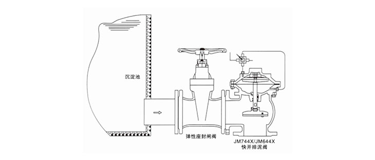 JM744X/JM644XB隔膜式液压、气动快开排泥阀,是一种由液压源或气动源执行机构的角型截断类阀门。通常成排安装在沉淀池底部外侧壁,用以排除池底沉淀的泥砂和污物。该阀由尼龙强化橡胶隔膜将阀门分为两个腔室,接通液压或气动源。采用电动或手动二位四通换向阀控制,实现快速排泥。该阀将隔膜代替活塞,无运动摩擦,更适用于泥浆等颗粒介质,大大提高了阀门的使用寿命。